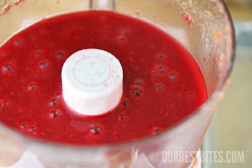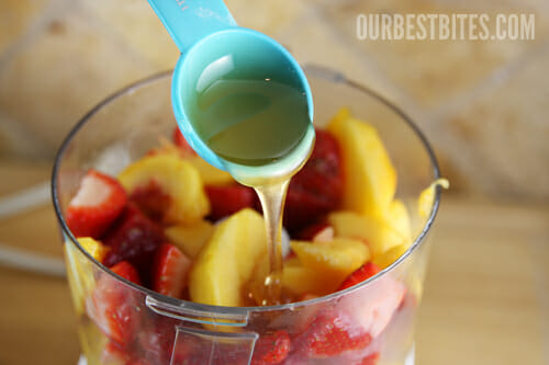 Taste the mixture after it’s smooth and add more sweetener if you need to. You need to be able to pour this mixture, so if you puree your fruit and it’s pretty thick, just add a little liquid. You can add water, or fruit juice.