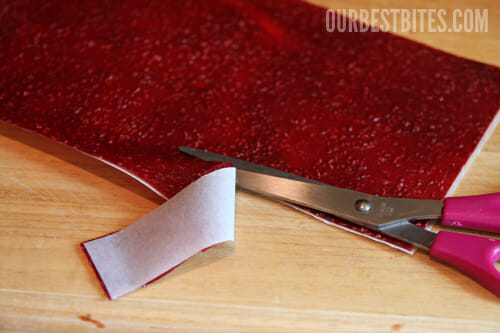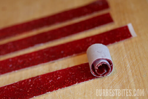 I like to use a pizza cutter and trim all of the edges (my kids love to eat that part) so I have nice clean lines to work with. Because I’m a freak like that. If you have a good (clean) pair of scissors, you could roll the whole sheet and then just snip all the way through the roll. If you’re like me and have 14 pairs of crappy scissors, none of which you can ever find when you actually need them, then cut into strips and then roll them up i ndividually. Or if you want large rolls of fruit, you can do it that way. I love these little one-inch segments because they’re a great size for kiddos.
