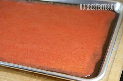 Spread Puree: Use an offset spatula to gently spread the mixture in an even layer. The more evenly you spread, the more evenly it cooks. Keep the mixture away from the edges like in the photo below. You’ll want it about 1/8″ thick. Your puree should be thin enough that it pours, but thick enough to stay put where you spread it.