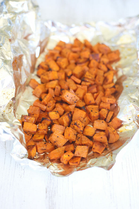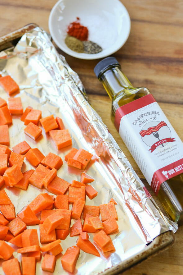 - Preheat oven to 400°F. Toss sweet potato chunks in oil and then toss with spices. Spread on a baking sheet and cook for about 20 minutes or until browning on edges.