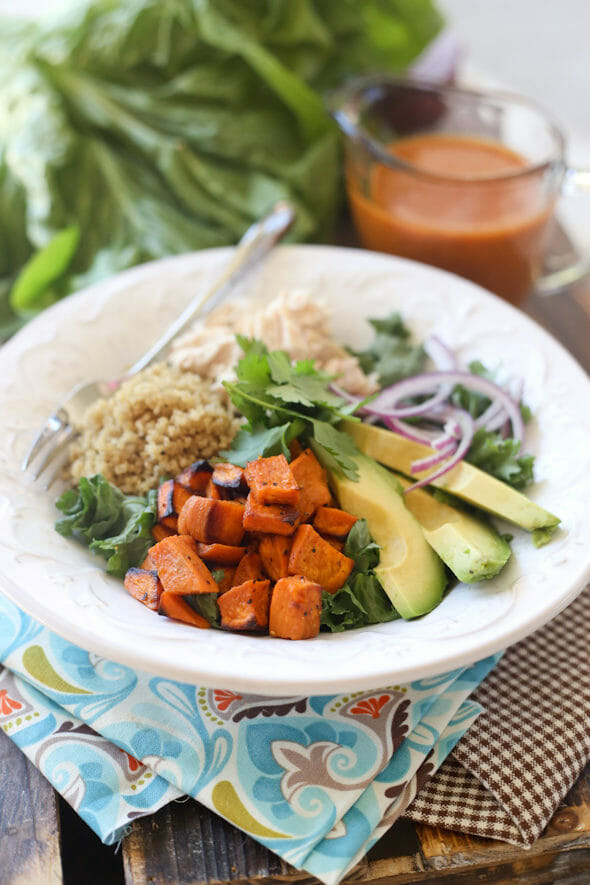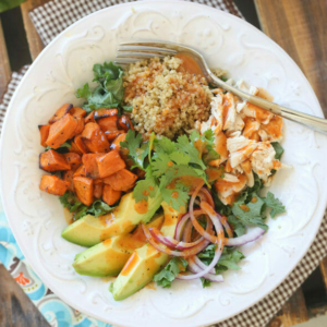 - There are quite a few components here, but if you keep them stocked in your fridge (some cooked quinoa, chicken that’s already chopped and ready, sweet potatoes that are done) it’s easy to throw together and eat for lunch or dinner a few days in a row.