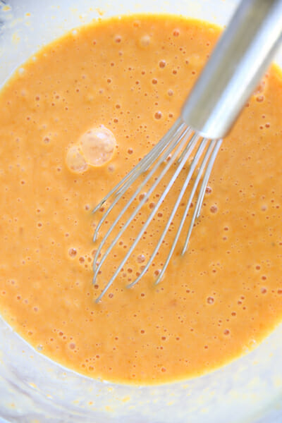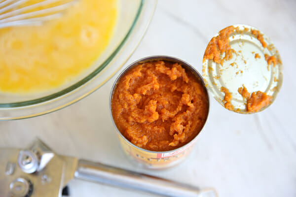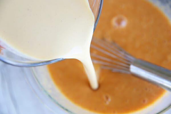 Whisk some pumpkin into the eggs so it’s a lovely orange color and nice and smooth. We’re using 1 cup of pumpkin, but keep the rest around. I have a recipe coming later this week that uses the exact amount you have left. (Or make a Pumpkin Pie Milkshake!)