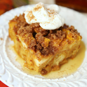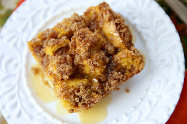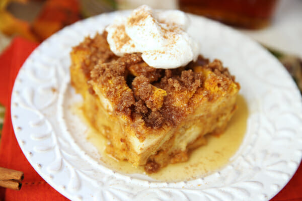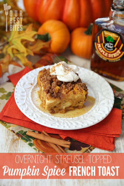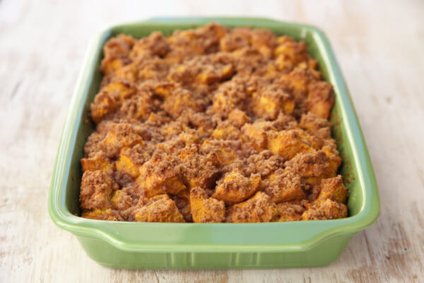 This weekend I took one of my favorites: Our Overnight Baked French Toast, and gave it an autumn-y makeover. It’s got the subtle warmth of pumpkin, and homey spices that scream fall time. I added an improved streusel crumb topping that knocks it out of the park, and when drizzled with melted butter and real maple syrup and topped with a dollop of whipped cream, this is pure heaven.