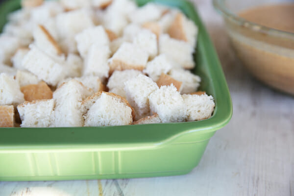 We’re going to pour this over some diced bread. I just grab a loaf of french bread from the grocery store bakery. I try and get it 2-3 days before I’m going to use it, and just leave it bagged and whole until you’re ready to use it. Then dice it up into 1-inch cubes.