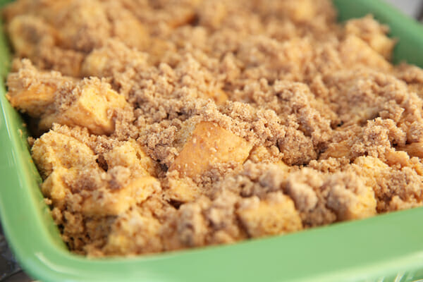 In the morning, pull your pan out while your oven is pre-heating and sprinkle the crumbly topping all over the top. Also, eat some of the crumbly topping, but try not to let anyone see you.
