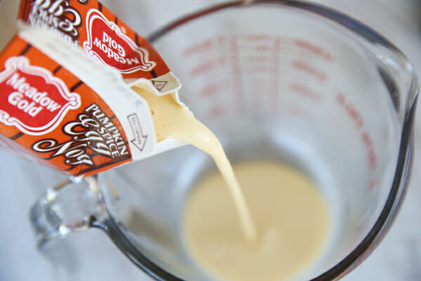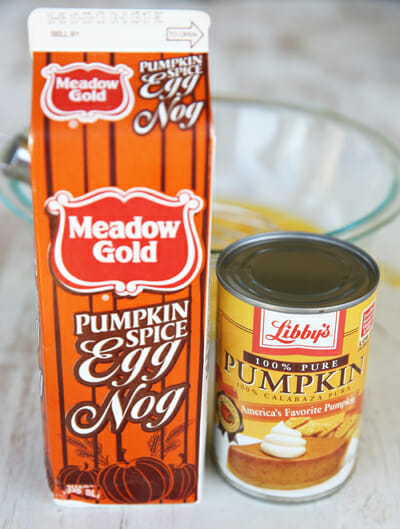 You can find pumpkin spice egg nog at most stores right now. If you look at the egg nog, the first 5 ingredients are: milk, cream, sugar, pasteurized egg yolks, and pumpkin puree. Basically everything that goes into a dish like this! The eggs add to the creamy custard, the cream adds richness, and then you get the extra pumpkin spice flavor.