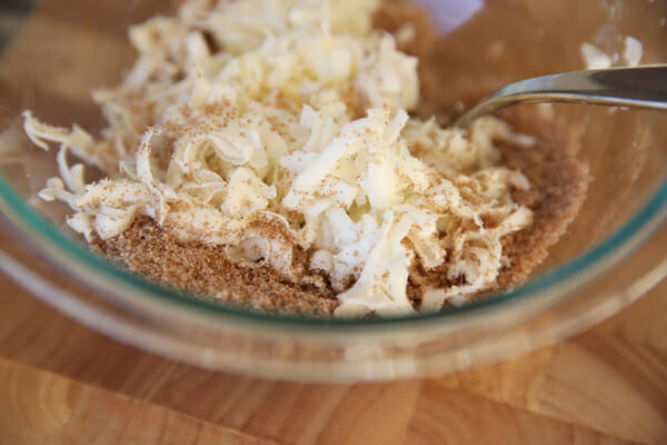 JK dudes, I just grated my cold butter with a cheese grater. Seriously- don’t put cheese in there. Then just use your fingers to crumble it all up. Place this little bowl in the fridge overnight.
