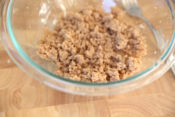 - In a small bowl, combine brown sugar, white sugar, flour, pumpkin pie spice, and cinnamon, Either grate butter with a large-hole cheese grater, or cut it into small chunks, and use fingers to crumble mixture together. Cover, and place crumb topping in fridge overnight.