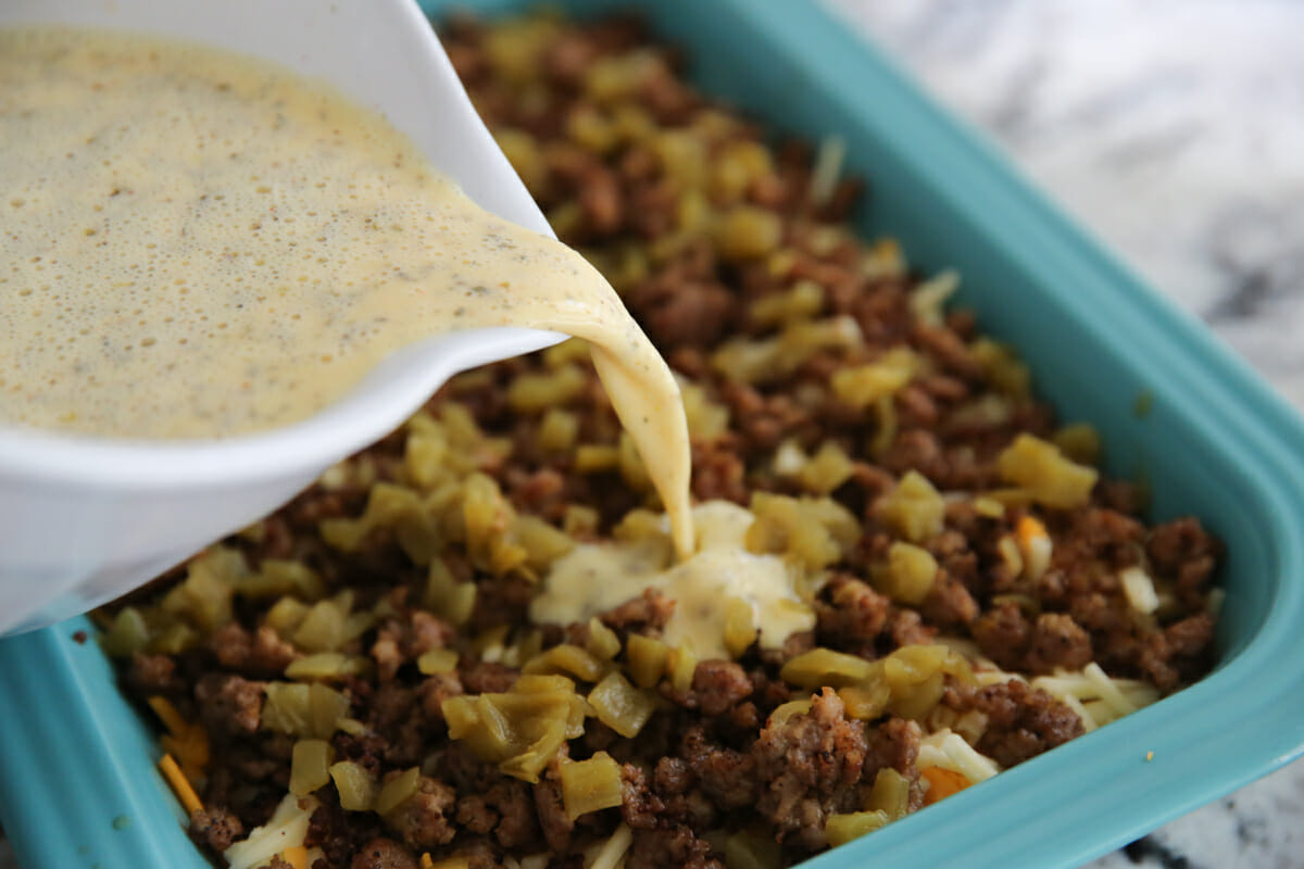 - Finally you’ll whisk together eggs, milk, and some spices and seasonings. Stir the egg mixture immediately before pouring on top of the assembled casserole. Otherwise all the spices will all gather in one spot and drop onto one single piece of casserole!
