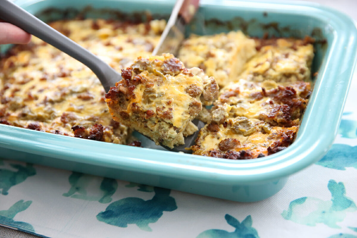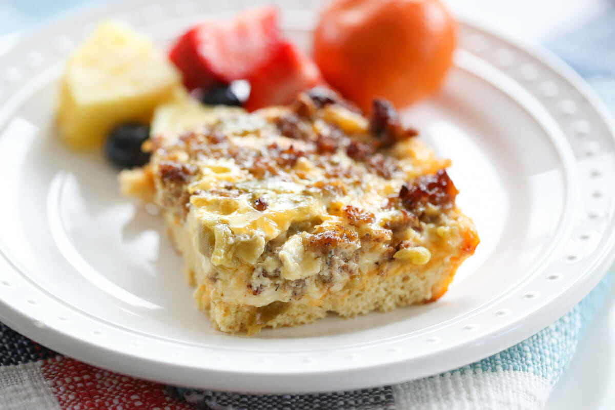 This easy overnight casserole is layered with bread, cheese, crumbled sausage and green chilis, and soaked in a seasoned egg custard overnight. It couldn’t be simpler to put together and the best part is in the morning when your kitchen is clean and your dishes are done and all you have to do is pop it in the oven! The popular casserole is a staple on many people’s holiday tables. At my house, it’s been our Christmas morning breakfast for over 40 years, and we love it on Easter and other special occasions, too. Wouldn’t be a holiday without it!