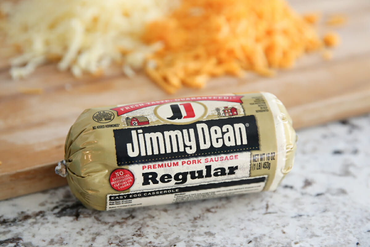 - Sausage – There are always a lot of questions when I have recipes that call for sausage of any kind. It’s probably because there are so many different types: breakfast sausage, Italian sausage, sausage in links, sausage in castings, sausage in tubes, sausage in 8 different sections of the supermarket! You’ll find this sausage in the fridge section, usually near the bacon. Avoid sausages with flavors like maple. I only use Jimmy Dean because that’s what my Mom always used and we like the flavor the best!